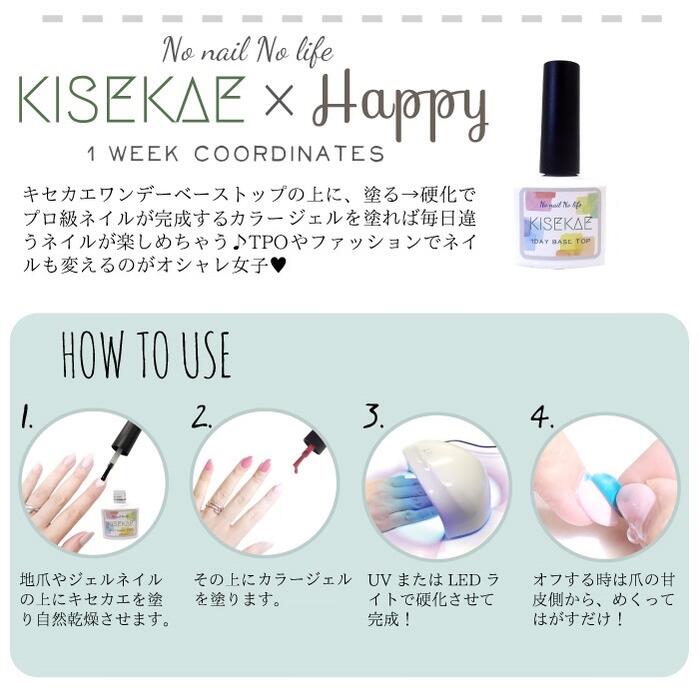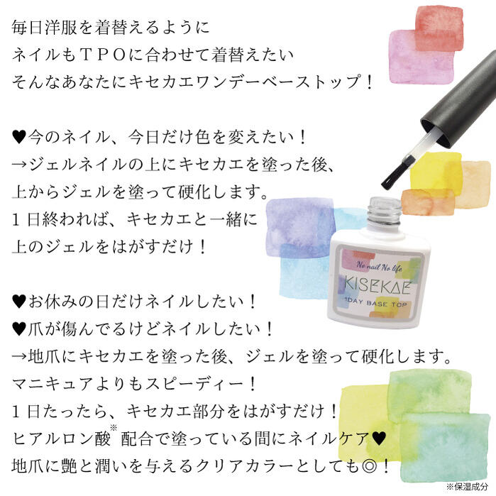 キセカエワンデーベーストップ [内容量] 10ml 日本製 化粧品登録済み(爪化粧料) [内容説明] どんなジェルネイルもはがしてオフ!マニキュアより早くて楽々♪
