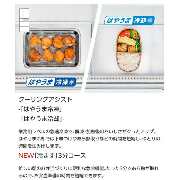 ■ Panasonic ■◆ 主な特長 ◆◆ 主な仕様 ◆各室容量冷蔵室:284L製氷室:18Lクーリングアシストルーム:30L冷凍室:103L野菜室:115L外形寸法幅685×奥行699×高さ1,828mm必要設置スペース幅695×奥行699×高さ1,868mm質量110kg年間消費電力量(50/60Hz)266kWh/年(JIS C 9801-3:2015)